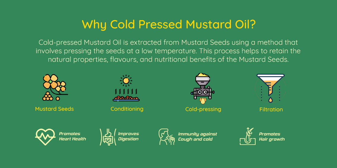 Cold-pressed mustard oil is less processed than regular mustard oil. Cold-pressed mustard oil retains more of its nutrients than regular mustard oil. Cold-pressed mustard oil has a higher smoke point than regular mustard oil, making it better for cooking.